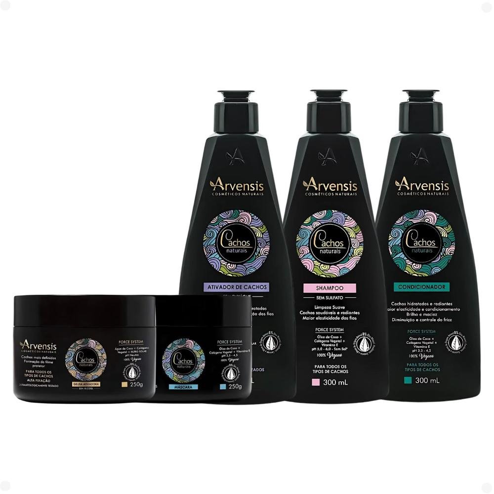 Kit Arvensis Cachos Naturais Cabelos Ondulados e Cacheados: Shampoo 300ml, Condicionador 300ml, Máscara 250g, Ativador de Cachos 300ml e Geleia Ativad
