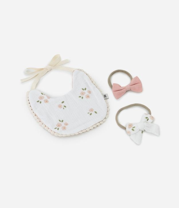 Kit Babador e Laços Infantis com Estampa Floral - Tam Único Rosa/Branco