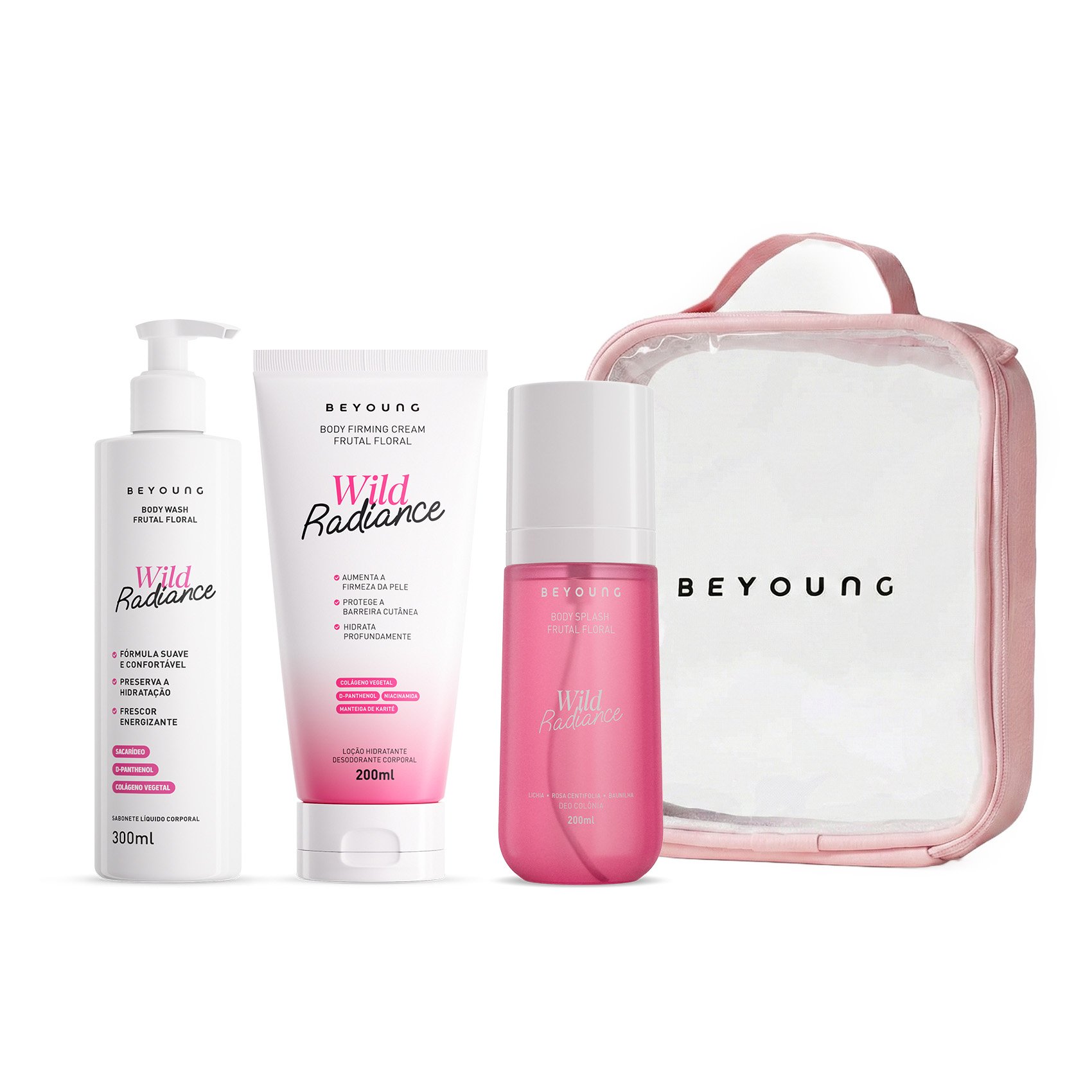 Kit Beyoung Linha Corporal Wild Radiance - 1 Body Splash + 1 Hidratante + 1 Sabonete Líquido + 1 Frasqueira Rosa
