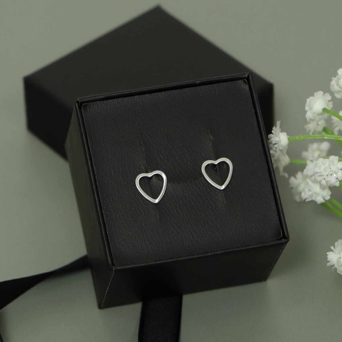 O nosso kit é composto por 1 brinco coração vazado prata 925 e 1 caixinha de presente tamanho pequeno na cor preta com laço.
