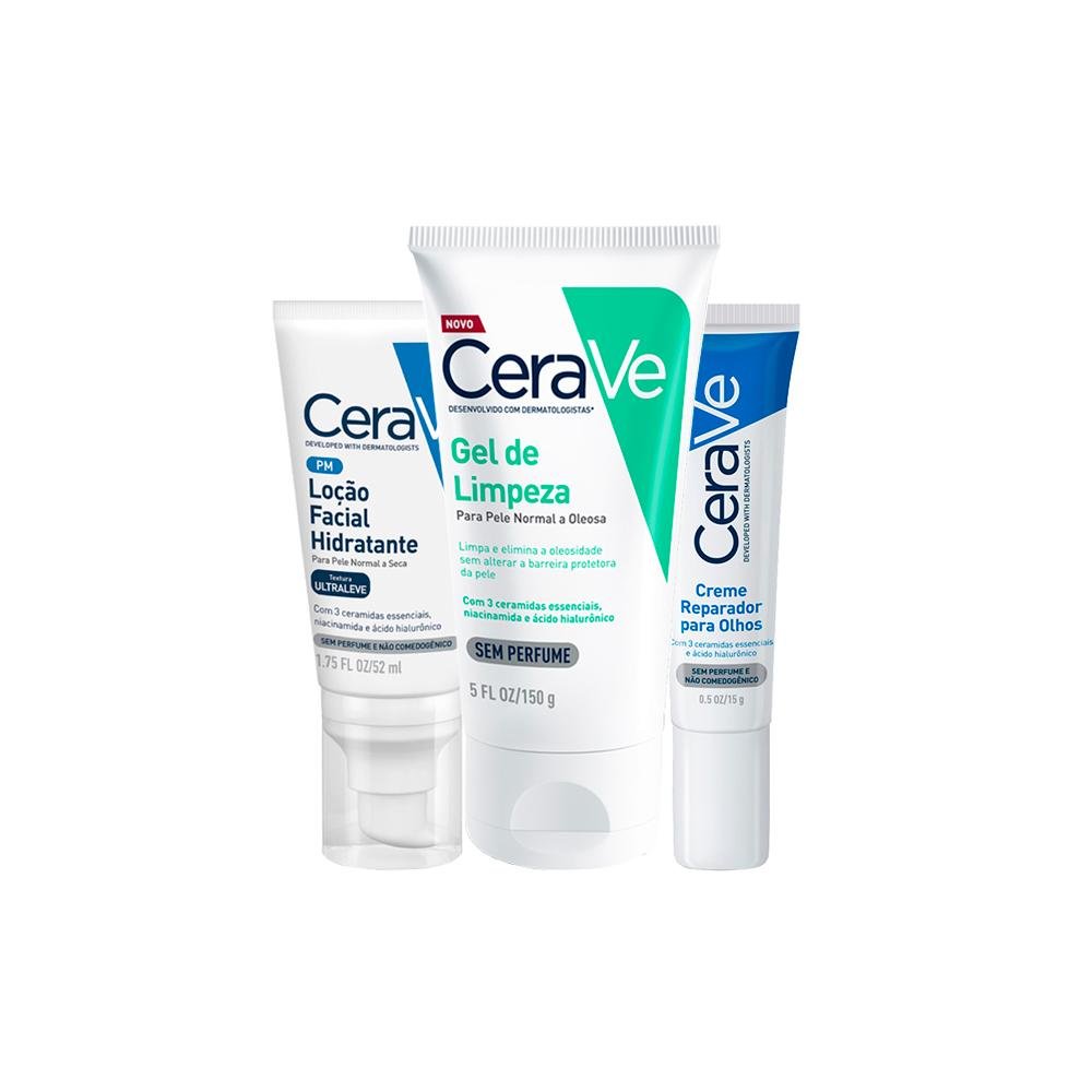 Kit CeraVe Facial - Gel Facial de Limpeza e Creme para os Olhos e Loção Hidratante