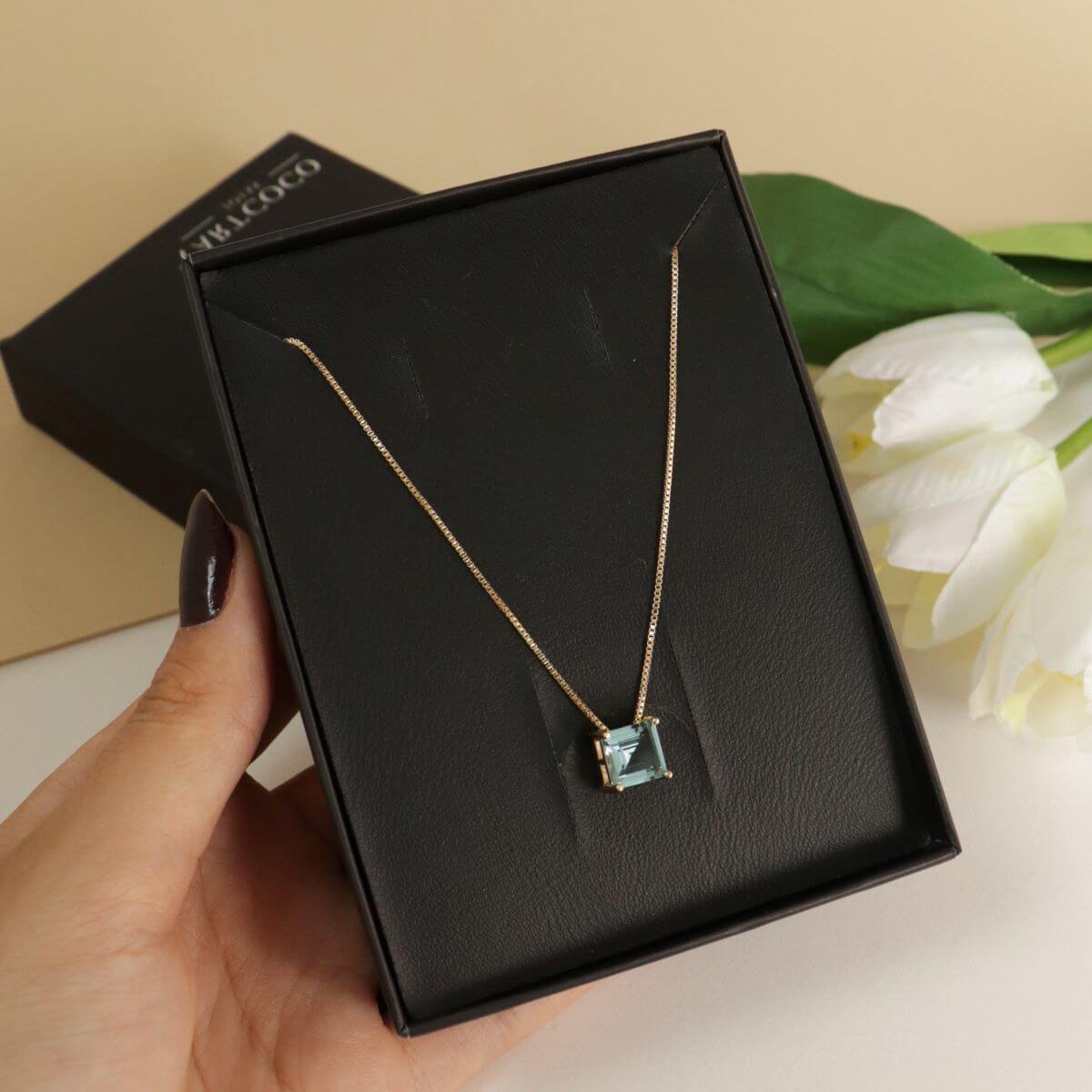 Kit Colar Zircônia Quadrada Azul G Folheado a Ouro 18k + Embalagem de Presente