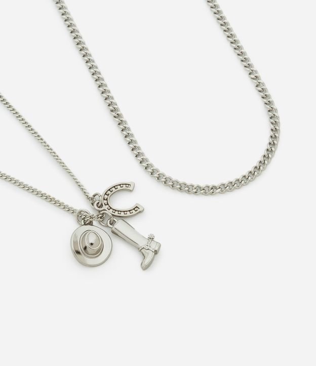 Kit com dois colares em metal prateado: um com corrente de elos largos e outro com elos curtos, com pingentes estilo western (chapéu, bota e ferradura). Fechamento por lagosta. Produzido com boas práticas ambientais.