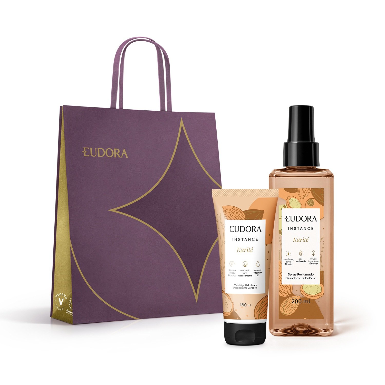O Combo Eudora Instance oferece hidratação profunda e perfumação com toque floral. A Manteiga Corporal, com Karité e Vitamina B5, nutre, protege do ressecamento e deixa a pele macia. O Spray Desodorante complementa a rotina com fragrância duradoura. Acompanha uma bela Sacola Eudora, ideal para presentear.