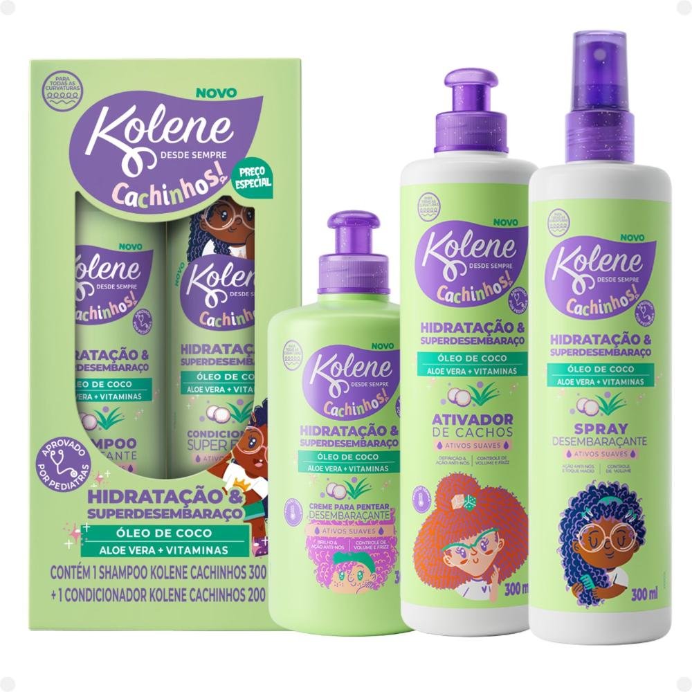 Kit Kolene Cachinhos: Shampoo 300ml, Condicionador 200ml, Creme para Pentear, Ativador de Cachos e Spray Desembaraçante