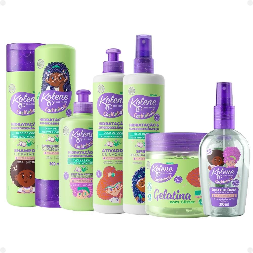 Kit Kolene Cachinhos: Shampoo, Condicionador, Creme para Pentear, Ativador de Cachos, Spray Desembaraçante, Gelatina e Deo Colônia