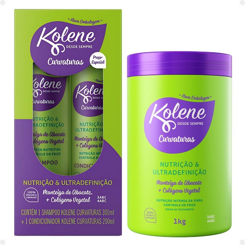 Kit Kolene Curvaturas Nutrição e Ultradefinição: Shampoo 300ml e Condicionador 200ml + Creme de Tratamento 1Kg