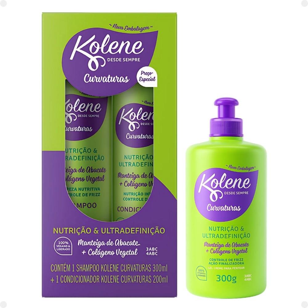 Kit Kolene Curvaturas Nutrição e Ultradefinição: Shampoo 300ml e Condicionador 200ml + Gel Creme para Pentear 300g