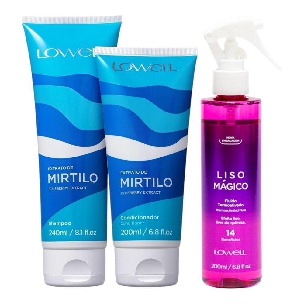 Kit Lowell Extrato de Mirtilo Shampoo 240ml + Condicionador 200ml + Liso Mágico Termoativado 200ml