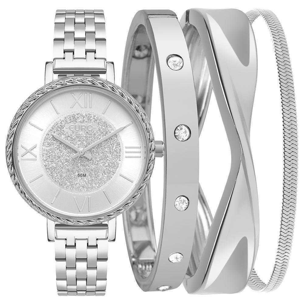 O Kit Relógio Euro Feminino Soul Prata - EU2036YVS/K4K entrega brilho e elegância em um conjunto perfeito para mulheres que amam acessórios sofisticados. Composto por um relógio analógico e três pulseiras modernas, esse kit é ideal para quem quer um visual completo, versátil e cheio de estilo.