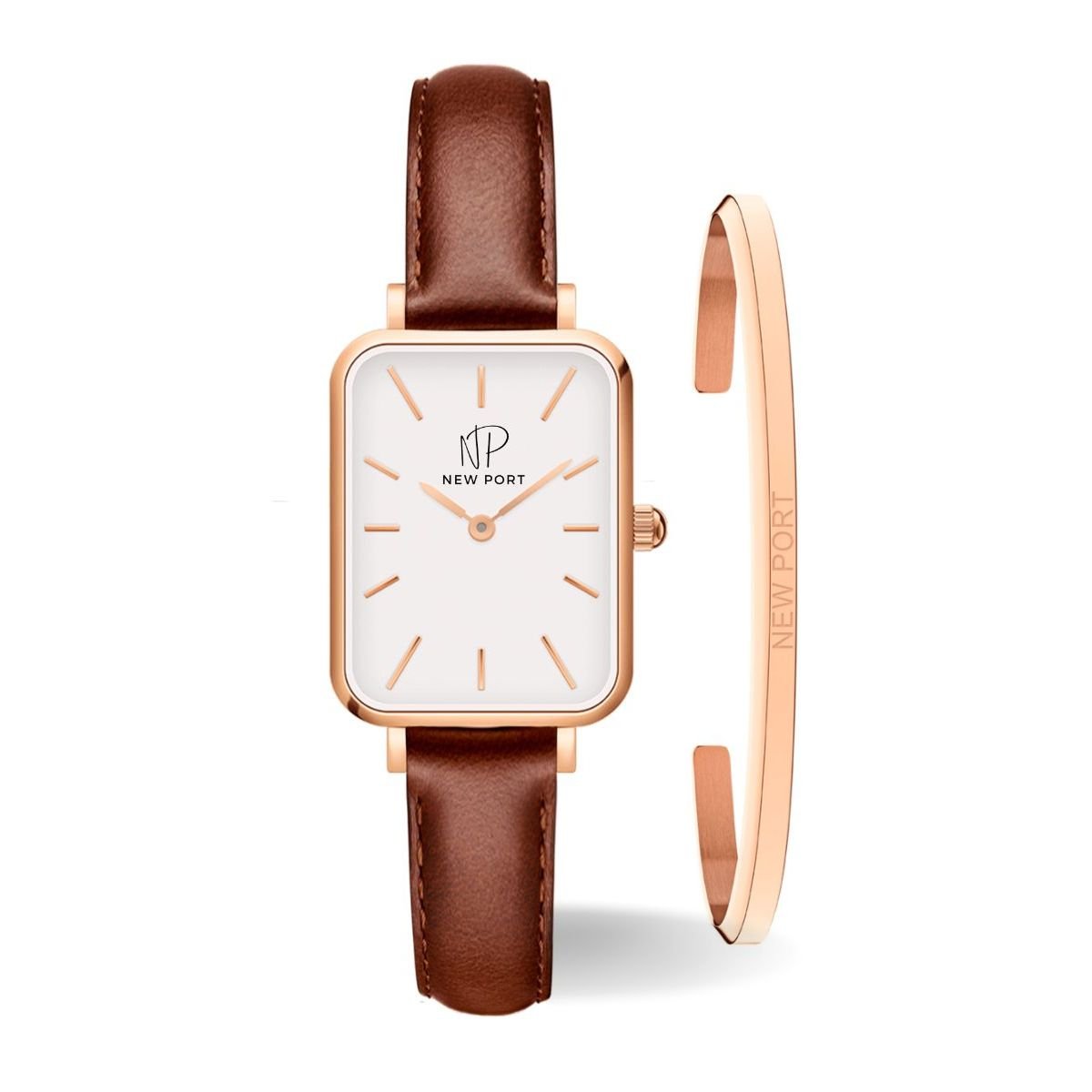 Kit Relogio Feminino Quadrado De Pulso Marrom New Port + Bracelete