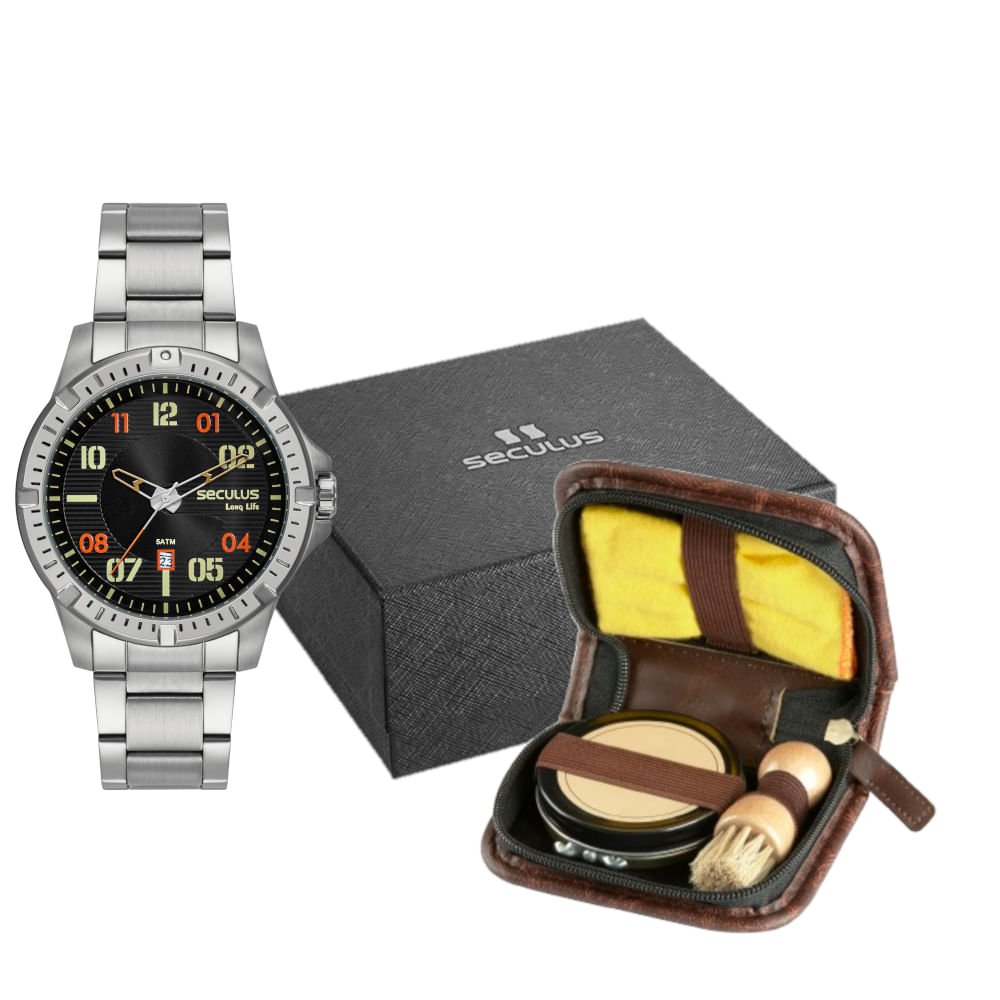 Kit Relógio Masculino Aço Com Calendário Prata Kit Engraxar