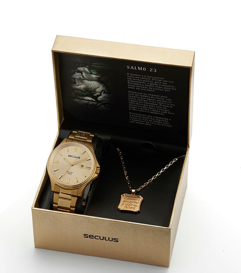 Kit Relógio Masculino com Colar Salmo 23 Dourado