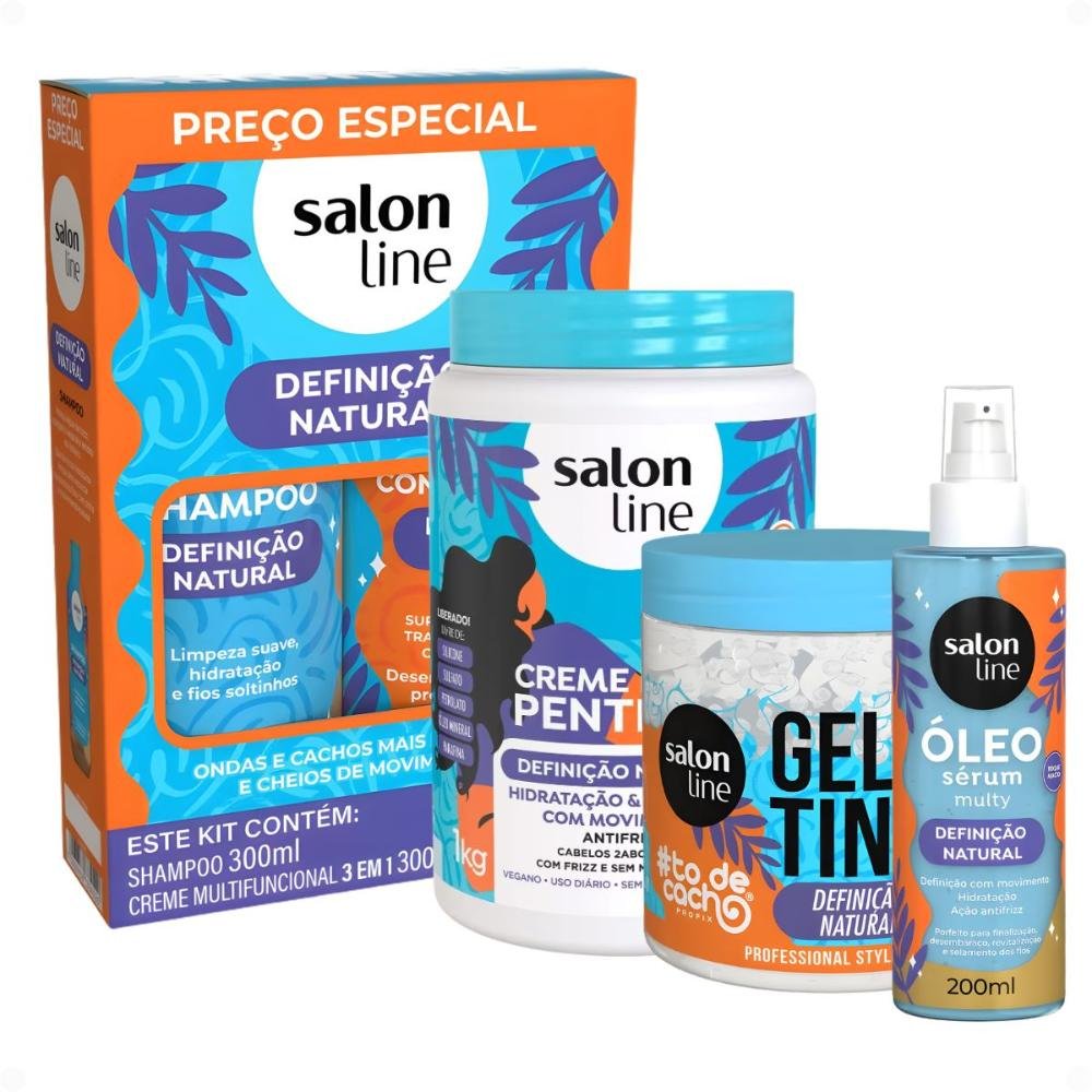 Kit Salon Line Definição Natural: Shampoo, Creme Multifuncional 300ml, Creme Para Pentear 1kg, Óleo Sérum 200ml e Gelatina Capilar 550g