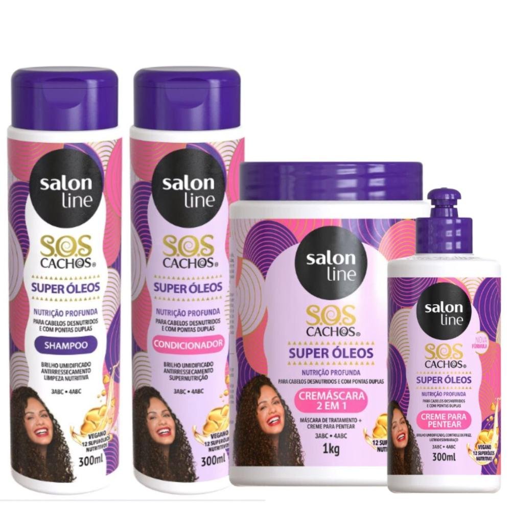 O Kit Salon Line S.O.S Cachos contém 1 Shampoo, 1 Condicionador, 1 Cremáscara 2 em 1 e um Creme Para Pentear da linha S.O.S Cachos Super Óleos Nutrição Profunda. Juntos, esses produtos garantem supernutrição para cabelos cacheados e crespos, ação antirressecamento, cacho com efeito brilho umidificado e, ainda, controle do frizz e definição.
