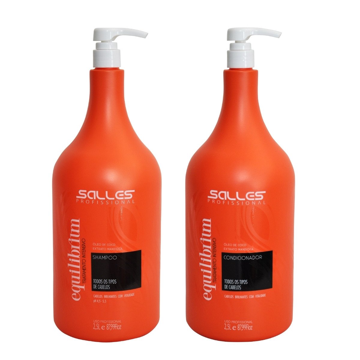 O Kit Equilibrium Capilar - Salles Profissional (2,5 Litro cada) e um sistema de tratamento que combina limpeza suave e hidratacao profunda em embalagem economica. Formulado com Oleo de Coco e Extrato de Mandioca, ele oferece cuidado completo para todos os tipos de cabelo, com efeito revelador de brilho, vitalidade e maciez desde o primeiro uso. Beneficios