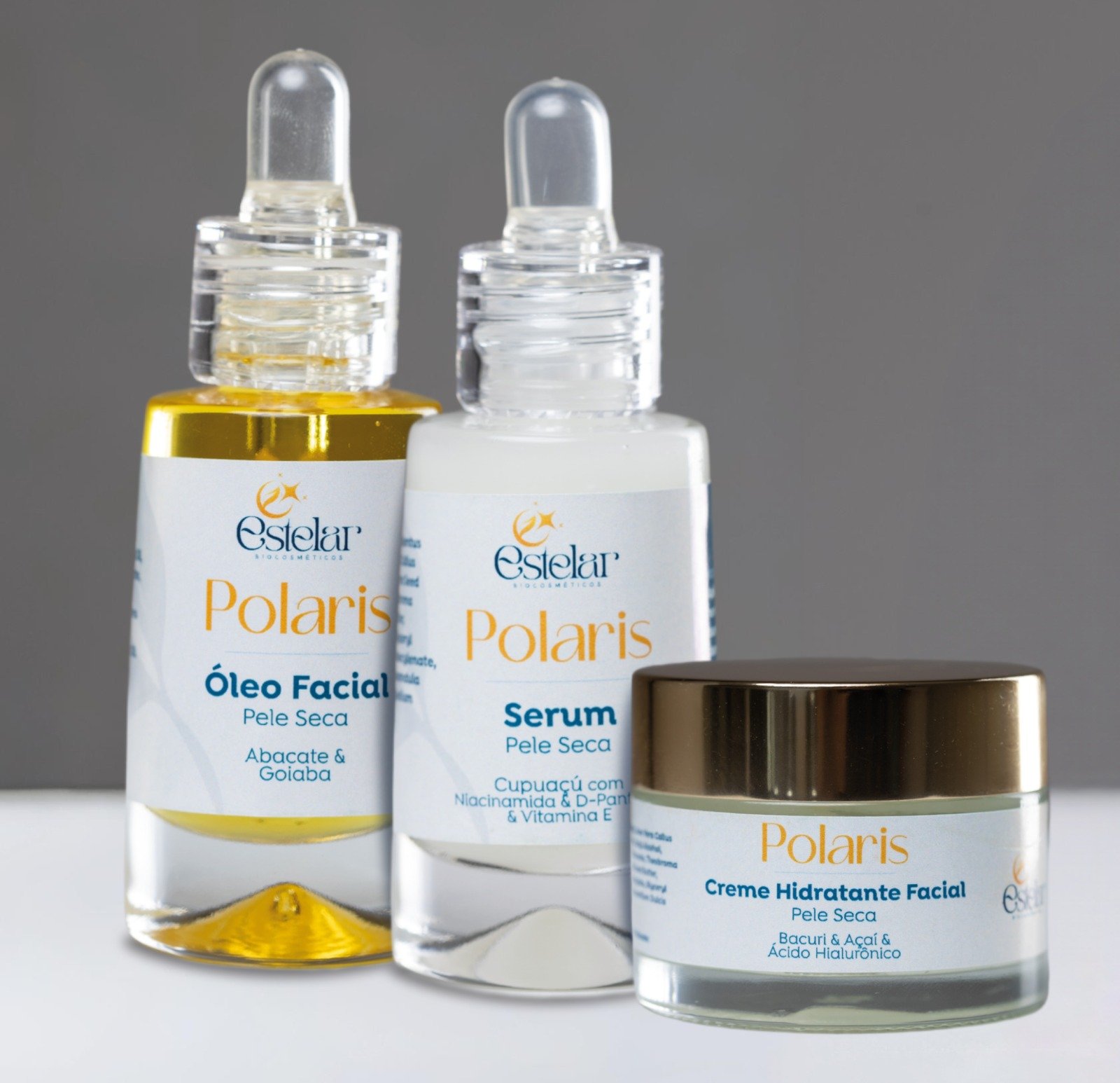 Kit Skincare Facial POLARISPara Pele SecaA linha Polaris foi construida para as peles que precisam manter a cutis saudavel e hidratada diariamente, de forma a nao perder seu brilho. Todos os produtos irao trabalhar o ressecamento, o descamamento, a falta de brilho as linhas de expressao e deixarao a sua pele linda e muito mais glamourosa.O Kit e composto por um Oleo Facial, um Serum Facial e um Hidratante Facial, que vao fazer sua skincare diaria, tanto no uso noturno, quanto no uso diurno. E o combro perfeito para ter uma pele viscosa, hidratada, sem sinais de ressecado e com um glow belissimo.Forma de uso:Skincare Noturno - usar o hidratante facial e o oleo facial;Skincare Diurno - usar o serum facial e o hidratante facial.O Kit contem:01 Oleo Facial Polaris (30ml)01 Serum Facial Polaris (30ml)01 Hidratante Facial Polaris (50ml)