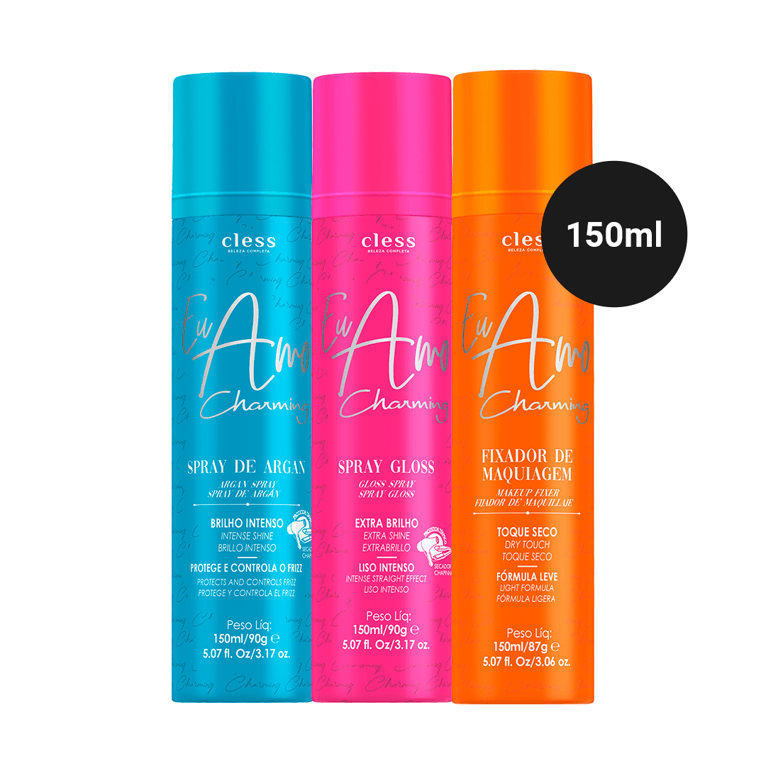 Kit Spray Argan + Spray Gloss Eu Amo Charming 150ml O Spray de Brilho Gloss Eu Amo Charming, é um leave in & reparador de pontas em aerossol, que desembaraça, sela a cutícula , facilita o deslizamento da escova e chapinha, intensifica o efeito liso e potencializa o brilho . O Spray de Brilho Gloss atua como protetor térmico que preserva os fios do calor do secador e da chapinha/prancha. Enriquecido com a tecnologia exclusiva Film Gloss® que forma uma fina película que alinha as camadas dos fios deixando o cabelo uniforme, mais brilhante e sem Frizz . O Spray de Brilho Argan eu Amo Charming, auxilia o reparo dos fios , reduz o frizz e dá brilho . Sua fórmula com Óleo de Argan oferece nutrição e ajuda a restaurar o cabelo seco e quebradiço. O Spray Argan atua como protetor térmico que preserva os fios do calor do secador e da chapinha/prancha. O Argan é rico em Vitamina E e ácidos graxos essenciais. Pode ser usado qualquer momento do dia para realçar o brilho e finalizar o penteado. O Spray Fixador de Maquiagem Eu Amo Charming mantém a maquiagem intacta por muito mais tempo! É indicado para todos os tipos de peles, seu toque seco não deixa a pele oleosa e prolonga o efeito da maquiagem seja no dia-a-dia ou para eventos e festas especiais em em ambientes fechados ou ao ar livre. Pode ser usado antes (para preparar a pele, como Primer) ou depois (para prolongar a fixação).