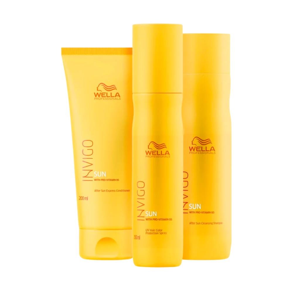 Kit com shampoo, condicionador e leave-in para cabelos expostos ao sol. Wella Professionals Invigo Sun Trio são os produtos necessários para manter seus fios saudáveis e bonitos após ir à praia ou piscina. O Kit Wella Professionals Invigo Sun Trio protege e resgata o aspecto natural do cabelo com fórmulas exclusivas, com Sun Blend e óleo de dasmasco, que limpas e hidratam os fios depois da exposição ao sol, água do mar ou cloro.