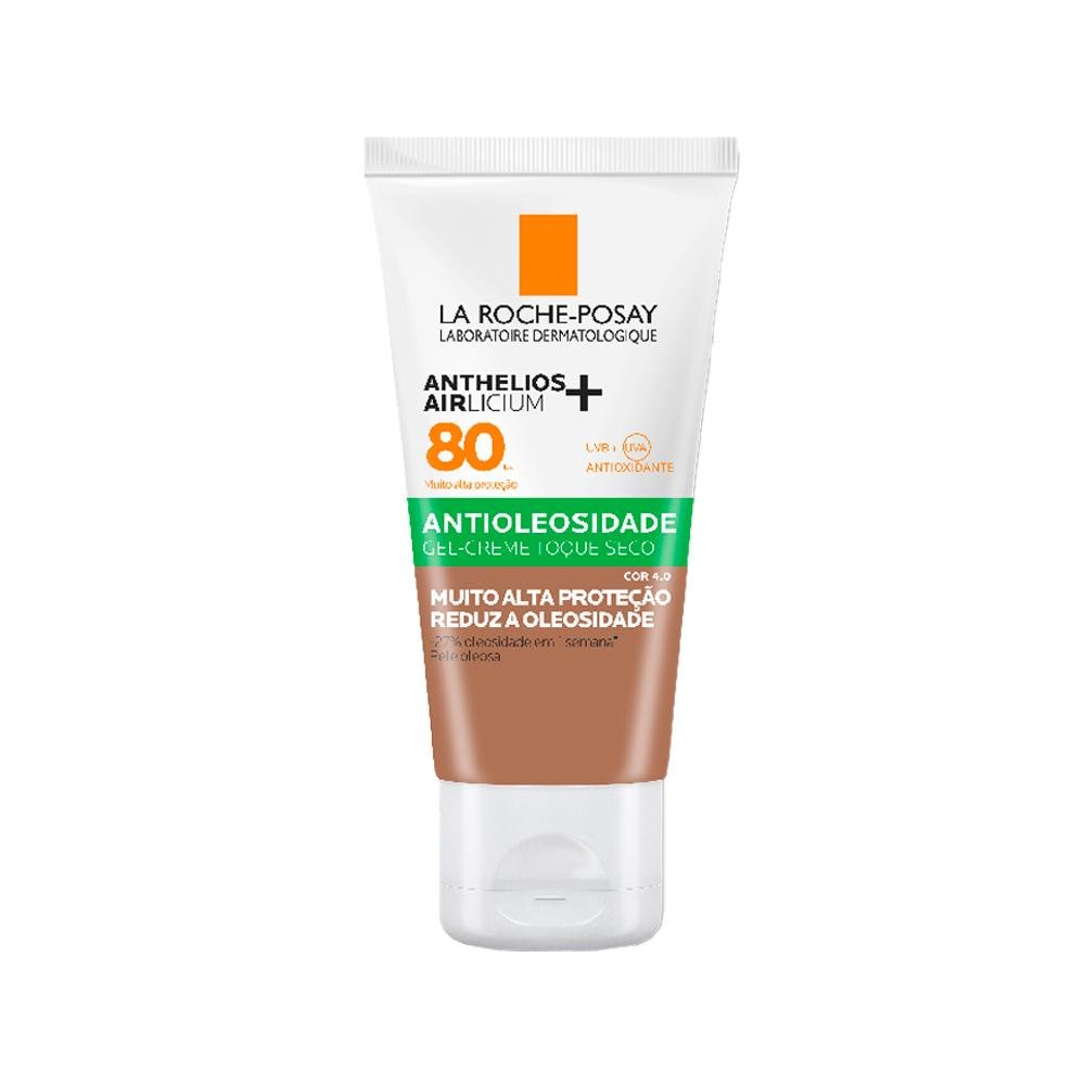 Protetor solar facial antioleosidade de Anthelios, La Roche-Posay. Anthelios Airlicium+ FPS80 possui um benefício que vai além do controle de oleosidade durante o uso, oferecendo um tratamento de redução da oleosidade em apenas uma semana (-27% oleosidade em 1 semana / -56% oleosidade em 4 semanas). Disponível em 6 cores para peles brasileiras (1.0, 2.0, 3.0, 4.0, 5.0 e 6.0), sendo esta a cor 4.0, proporciona cobertura uniforme ao longo do dia. Sua textura gel creme leve oferece rápida absorção, toque seco, não pesa, não escorre e não craquela. A pele é protegida com alta proteção solar (FPS80 / PPD33) e possui proteção comprovada contra pigmentação causada pela luz visível. Durante seu uso, todas as causas de brilho (oleosidade e umidade) são controladas ao longo do dia, proporcionando uma sensação de pele limpa e fresca por 12h. Filme protetor resistente mesmo em condições extremas.