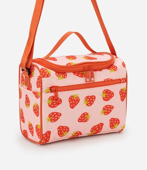 Lancheira adulto com divisórias e bolsos com zíper, alça longa ajustada e estampa de moranguinhos.