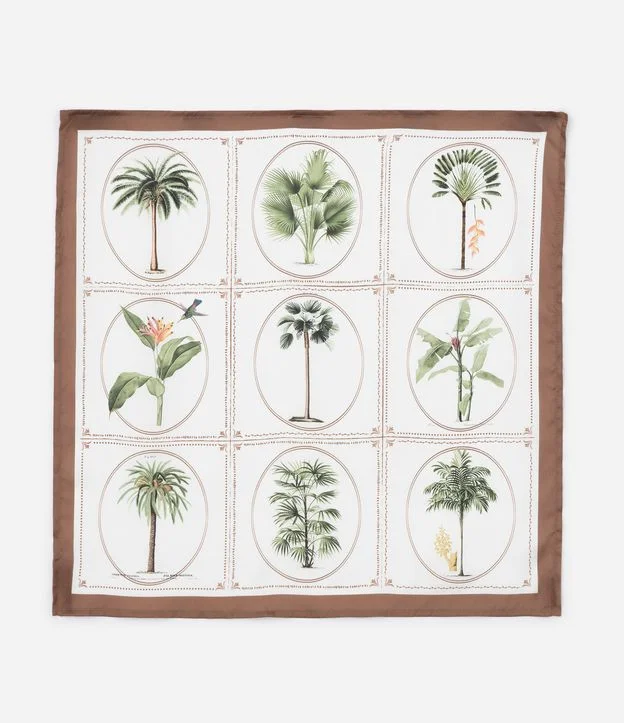 Lenço feminino acetinado com estampa botânica e viés contrastantes.