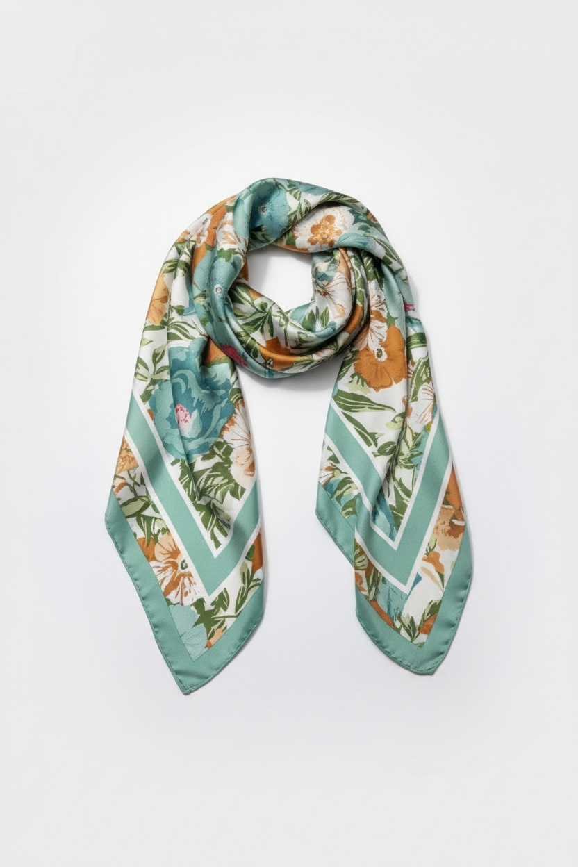 Lenco estampado nas cores verde, marrom, branco e rosa em cetim de seda, 90cm X 90cm