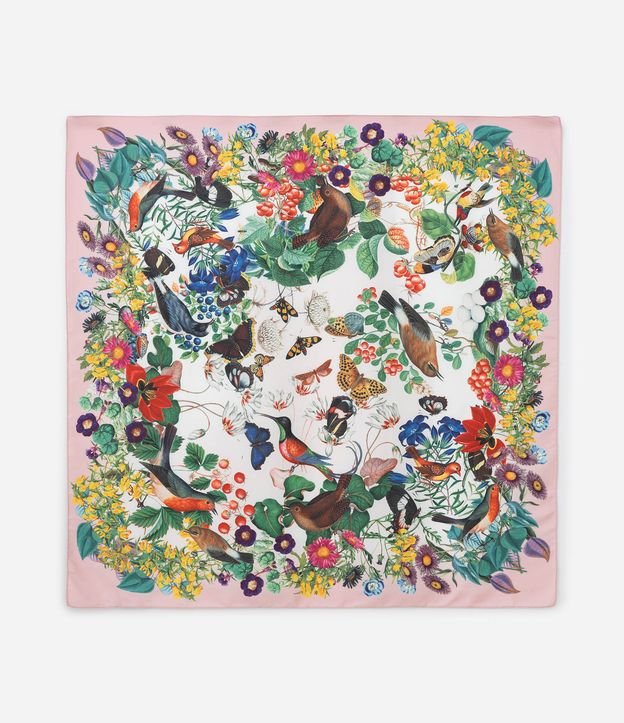 Lenço acetinado, com formato quadrado (90 x 90 cm) e estampado de motivos botânicos e aves.