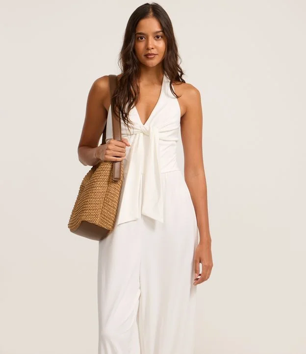 Macacão longo confeccionado em piquet, com decote v e detalhe de nó no busto que valoriza a silhueta. Modelagem aladim com pernas soltas e barra ajustada, garantindo conforto e elegância. Ideal para compor looks sofisticados e versáteis.