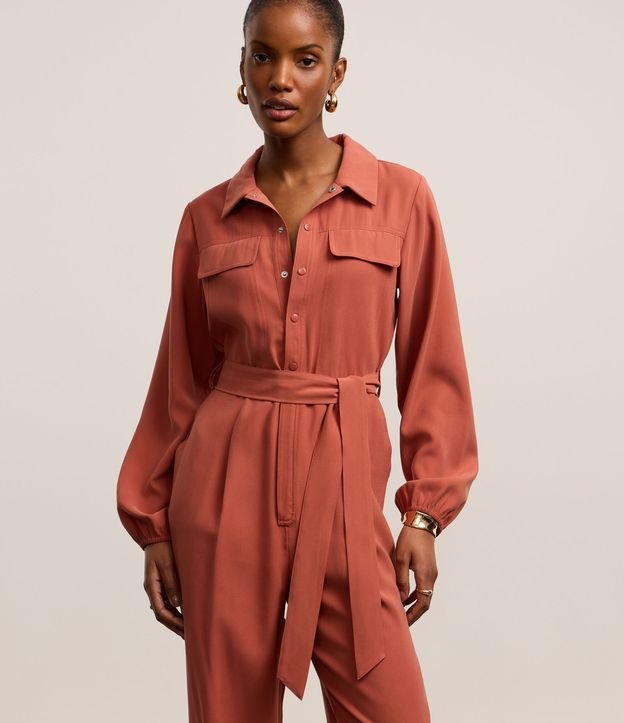 Macacão Alfaiatado em Viscolinho com Botões e Cinto de Tecido Terracota