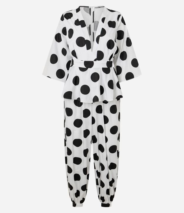 Macacão feminino confeccionado em tecido algodão mais sustentável através de boas práticas ambientais, no modelo balloon. Peça alfaiatada, com mangas longas, decote V profundo, detalhe peplum na cintura e estampa poá, ideal para compor looks sofisticados.