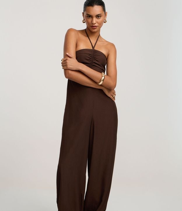 Macacão Boho Aladim Frente Única em Viscose com Busto Franzido Marrom Café