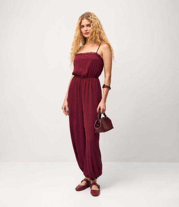 Macacão Cenoura em Chiffon com Renda e Cinto Metálico Vermelho