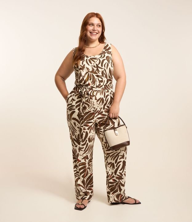 Macacão com Linho Estampa Folhas e Cinto Curve & Plus Size