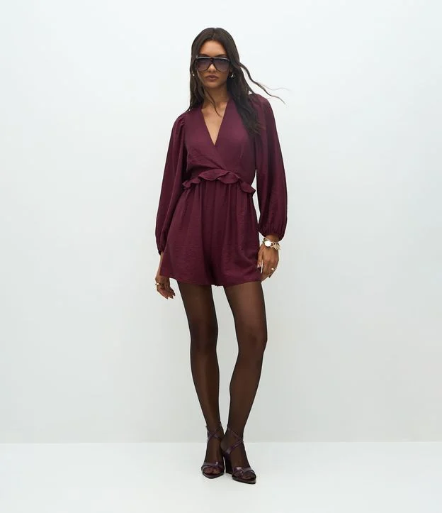 Macacão curto feminino em crepe confeccionado com viscose mais sustentável. Possui mangas longas bufantes, punhos ajustados, decote V cruzado, babado na linha da cintura, enquanto as costas têm fechamento discreto e elástico para acinturar.