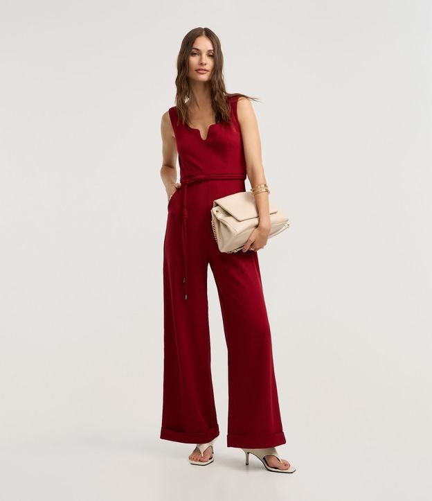 Macacão em Crepe com Decote Coração e Cinto Corda Vermelho