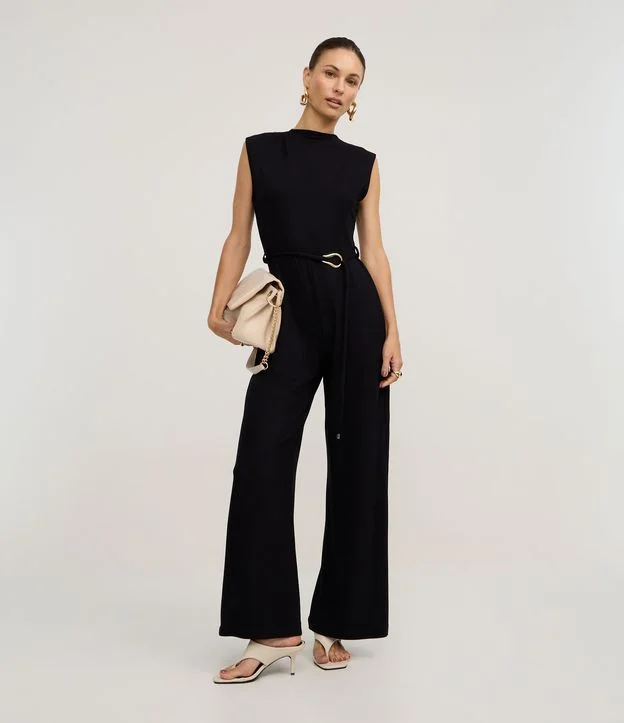 Macacão em Orly com Passantes e Cinto Afivelado Preto