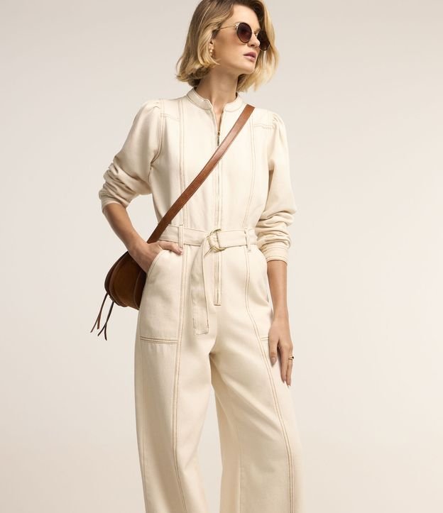 Macacão em Sarja com Cinto com Fivela e Manga Bufante Off White