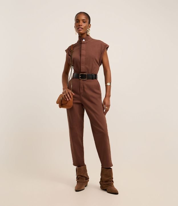 Macacão em Sarja Sem Manga com Botão Duplo Marrom