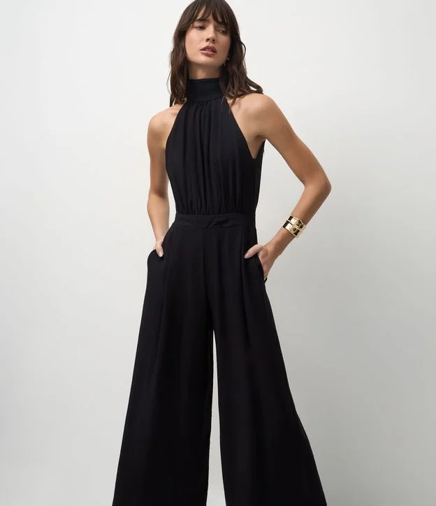 Macacão longo feminino confeccionado em viscose mais sustentável. Possui modelo halter neck com franzidos no decote. A cintura é marcada por recorte estruturado e as pernas são longas e costas com abertura ampla e fechamento por zíper discreto.