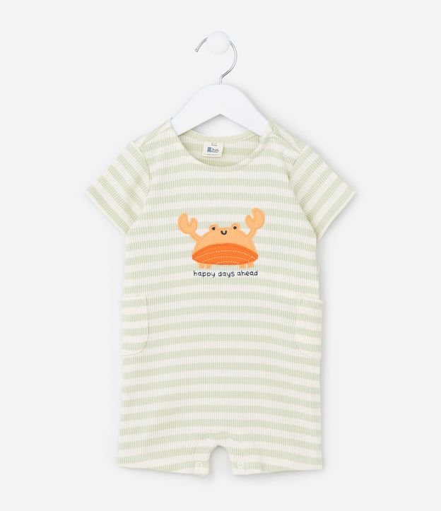 Macacão Infantil com Bordado de Caranguejo e Listras Canelado - Tam 0 a 18 Meses Verde