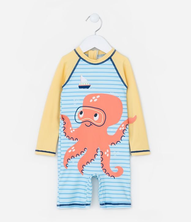 Macacão Infantil com Proteção UV Estampa Polvo - Tam 1 a 4 Anos Amarelo/Azul