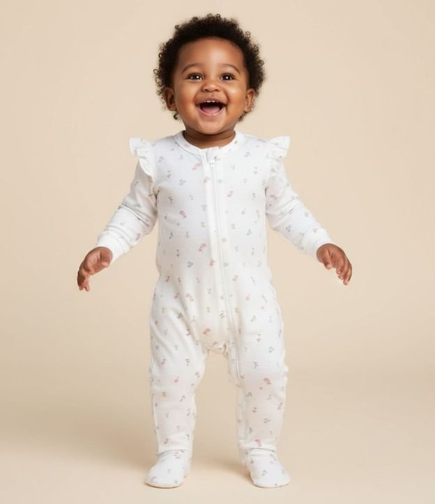 Macacão longo de plush para bebês, super quentinho para os dias frios! Peça estampada com babadinho nas cavas, fechamento frontal por zíper, pézinhos fechados e estampa floral.