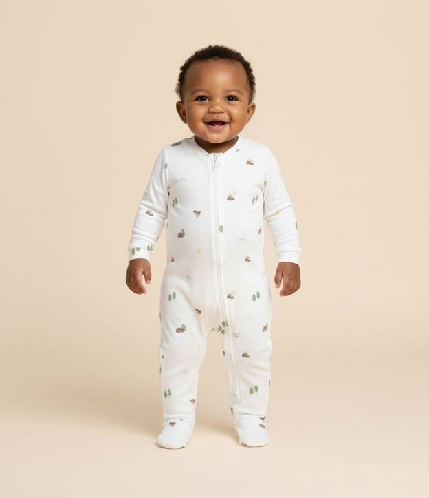 Macacão infantil longo confeccionado em algodão certificado BCI e boas práticas ambientais. Possui zíper frontal com protetor, estampa fullprint de ícones aquarelados, punhos macios e pés com antiderrapante, garantindo aconchego, praticidade e toque suave para os momentos do bebê.