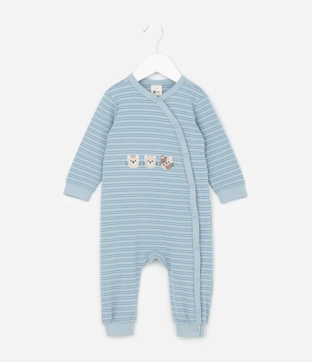Macacão Infantil em Suedine com Estampa de Gatos e Listrado - Tam 0 a 18 meses Azul