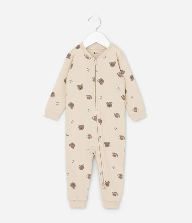 Macacão infantil confeccionado em algodão certificado BCI e boas práticas ambientais, em suedine leve com estampa de ursinhos e bolas esportivas. Possui gola redonda, mangas longas, zíper frontal duplo e bordado aplicado no bumbum. Estrutura macia ideal para o conforto do bebê.