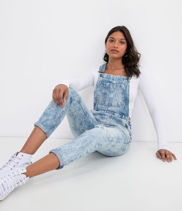 Macacão Jeans com Bolsos e Puídos