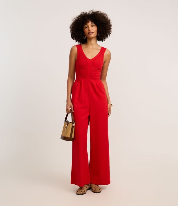 • Macacão Longo em Sarja com Detalhe Entremeio Vermelho 3