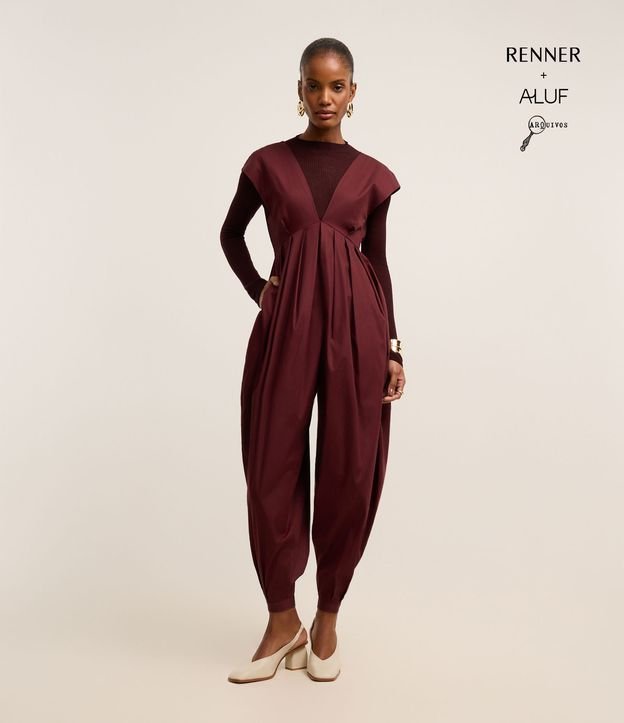 Macacão longo com alça larga, decote V com pregas frontais, bolsos e confeccionado em tricoline com algodão bci mais sustentável e produzido através de boas práticas ambientais.