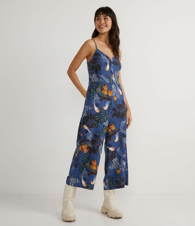 Macacão Pantacourt em Viscolinho com Estampa de Folhagem